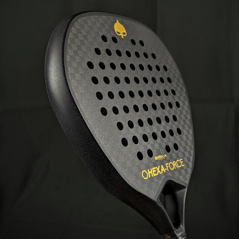 Set comprenant une raquette de padel Birka Hexa-force 12K Carbon ainsi qu'un manchon en silicone Hesacore Tour Grip; accessoire permettant une augmentation de l'épaisseur du manche ainsi qu'un maintien optimal.